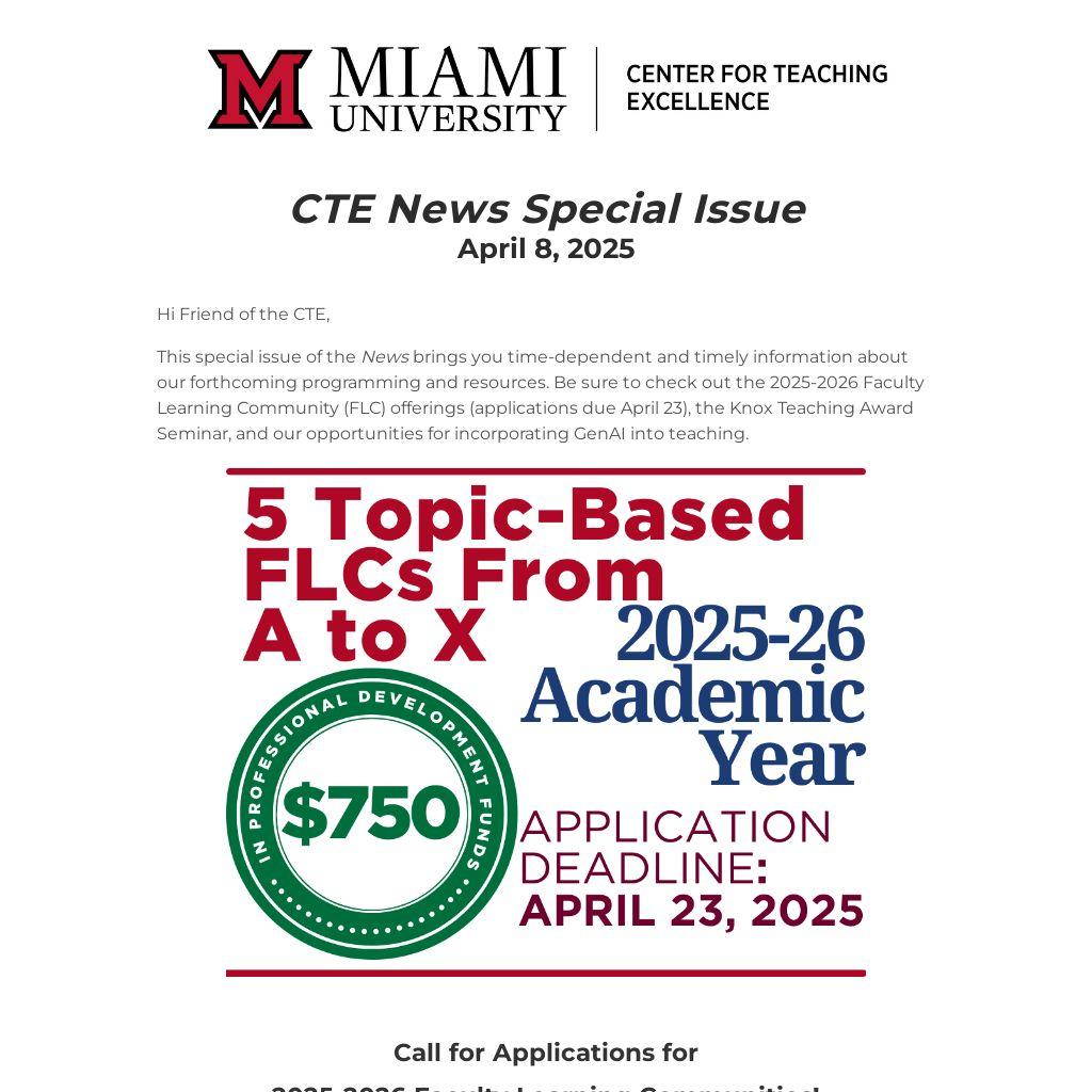 This special issue of the News brings you time-dependent and timely information about our forthcoming programming and resources. Be sure to check out the 2025-2026 Faculty Learning Community (FLC) offerings (applications due April 23), the Knox Teaching Award Seminar, and our opportunities for incorporating GenAI into teaching.