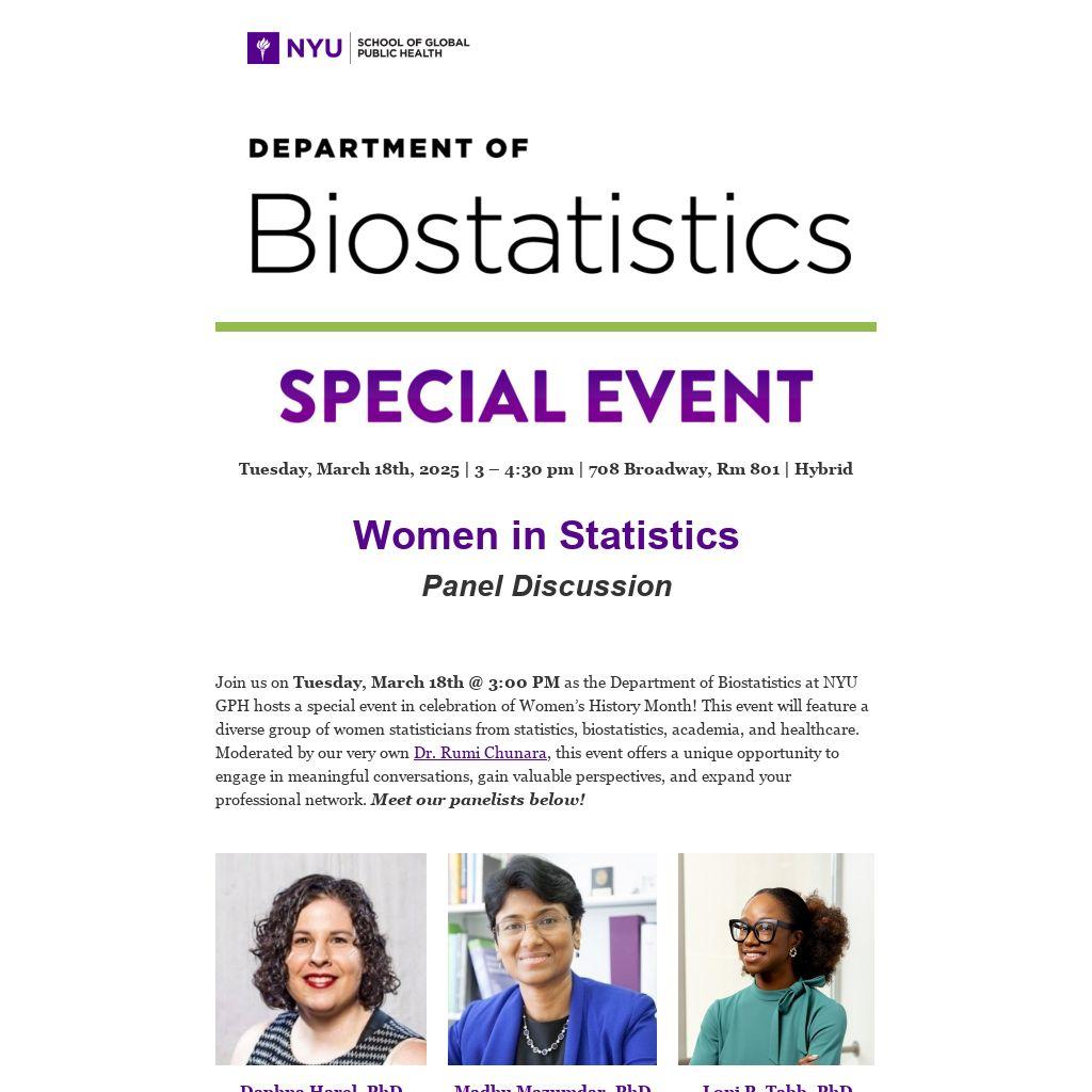 Join us on Tuesday, March 18th @ 3:00 PM as the Department of Biostatistics at NYU GPH hosts a special event in celebration of Women’s History Month! This event will feature a diverse group of women statisticians from statistics, biostatistics, academia, and healthcare. Moderated by our very own Dr. Rumi Chunara, this event offers a unique opportunity to engage in meaningful conversations, gain valuable perspectives, and expand your professional network. Meet our panelists below!