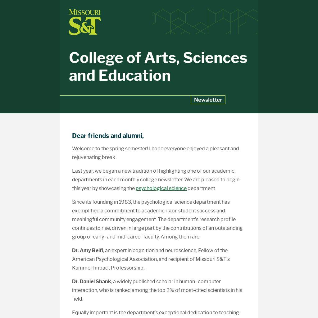 Finally, the department launched its new applied psychology Ph.D. program last year, making it the first social science doctoral degree offered at Missouri S&T. This innovative program is well positioned to prepare students to address emerging challenges in mental health, cognitive science, organizational psychology and other applied domains.