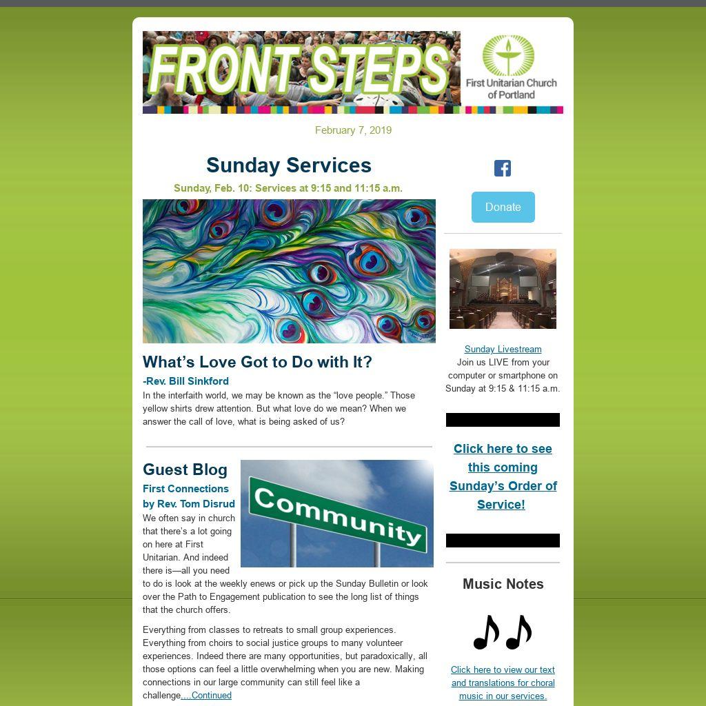 Do You Have an Item for E-news and/or the Sunday Bulletin?If you have an item you’d like published in our weekly Front Steps (eNews) or the Sunday Bulletin, please submit it to: