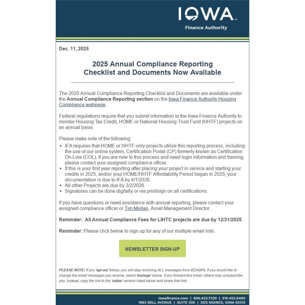 The 2025 Annual Compliance Reporting Checklist and Documents are available under the Annual Compliance Reporting section on the Iowa Finance Authority Housing Compliance webpage.