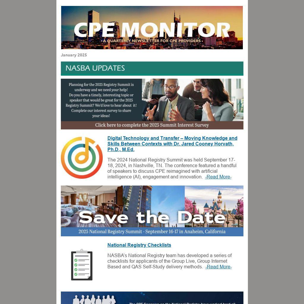 Click here to see the organizations that have been added to the National Registry of CPE Sponsors from October 1, 2024 through December 31, 2024.
