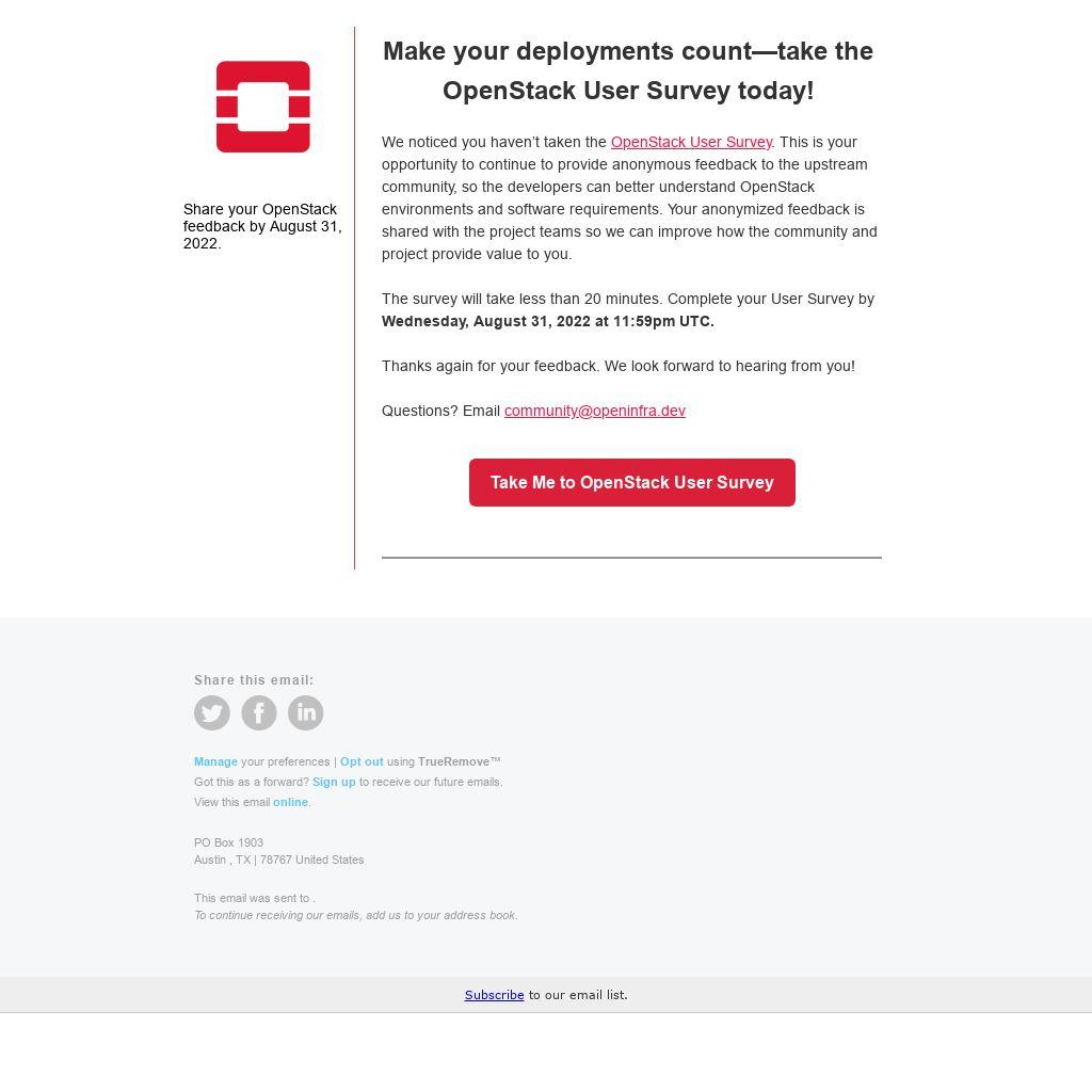We noticed you haven’t taken the OpenStack User Survey. This is your opportunity to continue to provide anonymous feedback to the upstream community, so the developers can better understand OpenStack environments and software requirements. Your anonymized feedback is shared with the project teams so we can improve how the community and project provide value to you.