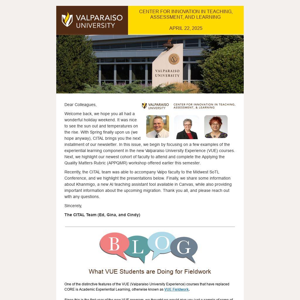 Welcome back, we hope you all had a wonderful holiday weekend. It was nice to see the sun out and temperatures on the rise. With Spring finally upon us (we hope anyway), CITAL brings you the next installment of our newsletter. In this issue, we begin by focusing on a few examples of the experiential learning component in the new Valparaiso University Experience (VUE) courses. Next, we highlight our newest cohort of faculty to attend and complete the Applying the Quality Matters Rubric (APPQMR) workshop offered earlier this semester.