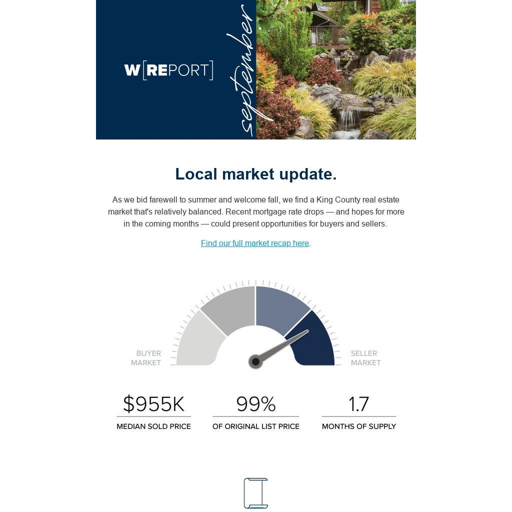 As we bid farewell to summer and welcome fall, we find a King County real estate market that's relatively balanced. Recent mortgage rate drops — and hopes for more in the coming months — could present opportunities for buyers and sellers.