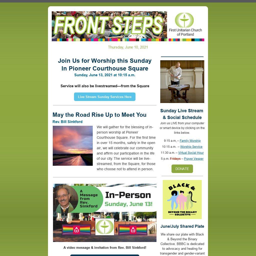 Join Us for Worship this SundayIn Pioneer Courthouse SquareSunday, June 13, 2021 at 10:15 a.m.