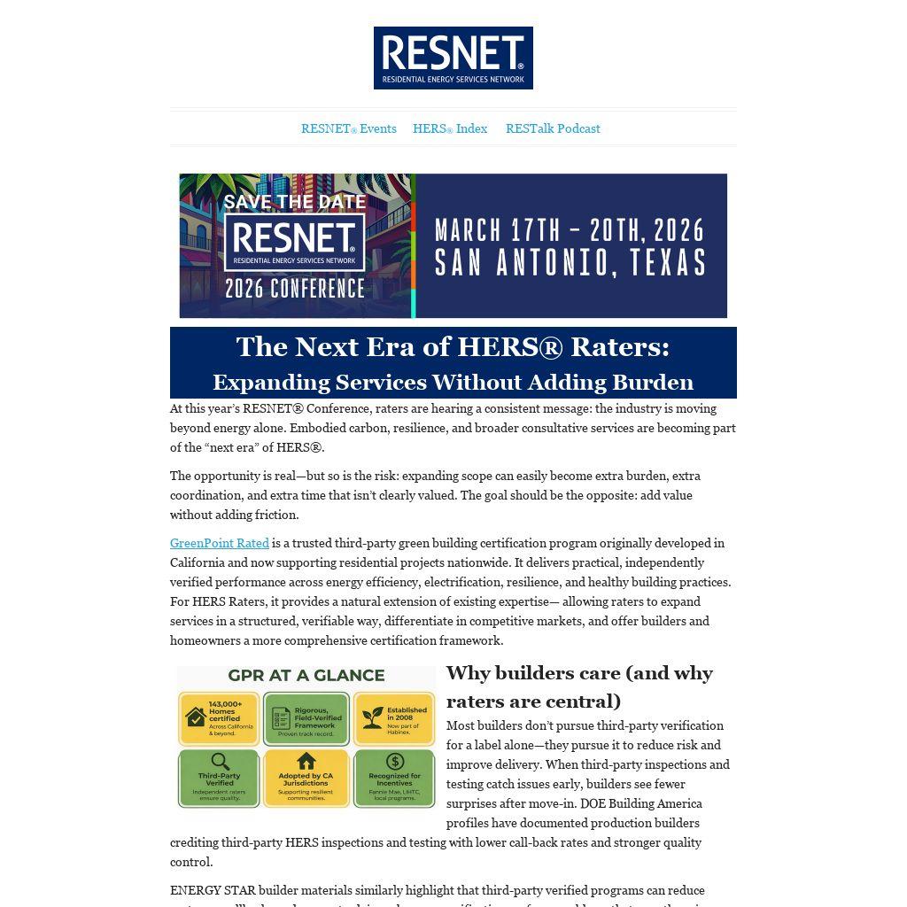 At this year’s RESNET® Conference, raters are hearing a consistent message: the industry is moving beyond energy alone. Embodied carbon, resilience, and broader consultative services are becoming part of the “next era” of HERS®.