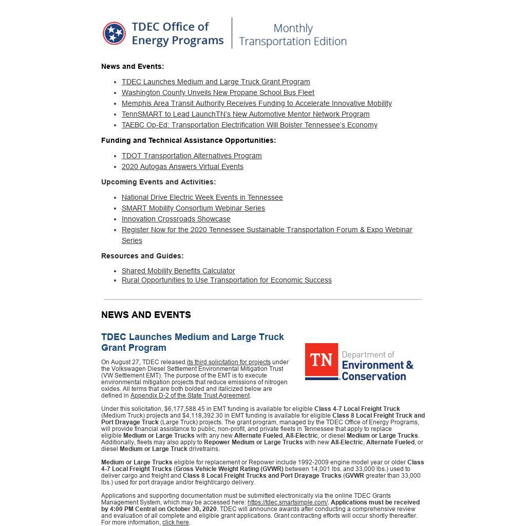 Under this solicitation, $6,177,588.45 in EMT funding is available for eligible Class 4-7 Local Freight Truck (Medium Truck) projects and $4,118,392.30 in EMT funding is available for eligible Class 8 Local Freight Truck and Port Drayage Truck (Large Truck) projects. The grant program, managed by the TDEC Office of Energy Programs, will provide financial assistance to public, non-profit, and private fleets in Tennessee that apply to replace eligible Medium or Large Trucks with any new Alternate Fueled, All-Electric, or diesel Medium or Large Trucks. Additionally, fleets may also apply to Repower Medium or Large Trucks with new All-Electric, Alternate Fueled, or diesel Medium or Large Truck drivetrains.