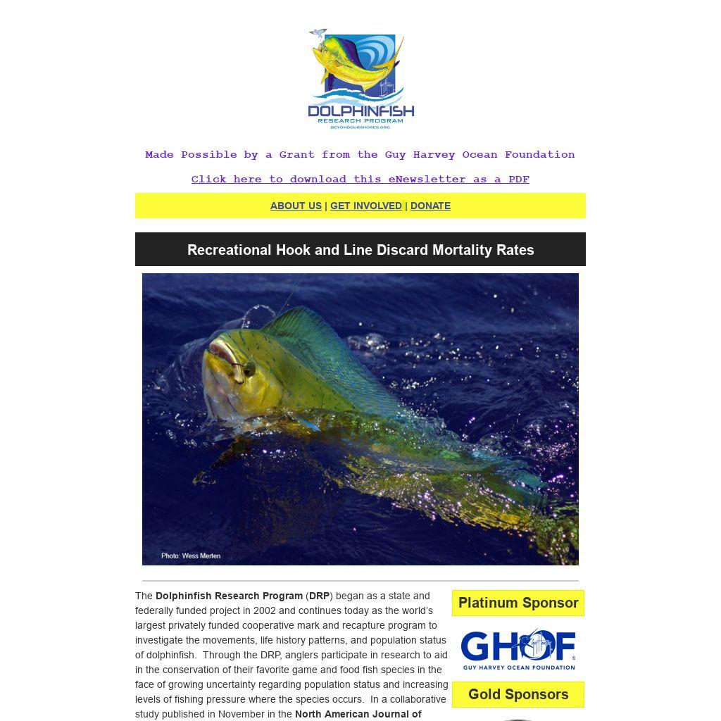 with additional data collected by NCSU from 2016 to 2018 off North Carolina to estimate the fate of discarded dolphinfish in the U.S. South Atlantic, Gulf of Mexico, and U.S. Caribbean Sea recreational hook and line fishery. The study, led by Drs. Paul Rudershausen and Jeff Buckel of NCSU as well as Stephen Poland of North Carolina's Division of Marine Fisheries, modeled the fate of released fish and observed high discard mortality rates >20%, results that suggest that without effective education on reducing hook trauma while fishing for dolphin, the benefits of minimum sizes (e.g., <20” in the South Atlantic Bight) and bag limits established to control fishing mortality are not being fully realized. Read more below about the actions we are taking to impart change to decrease fishing mortality and increase the conservation of dolphin.