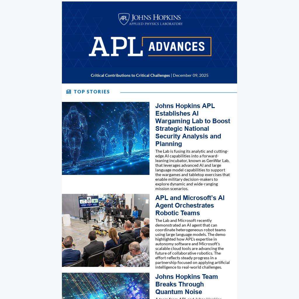 The Lab and Microsoft recently demonstrated an AI agent that can coordinate heterogeneous robot teams using large language models. The demo highlighted how APL's expertise in autonomy software and Microsoft’s scalable cloud tools are advancing the future of collaborative robotics. The effort reflects steady progress in a partnership focused on applying artificial intelligence to real-world challenges.