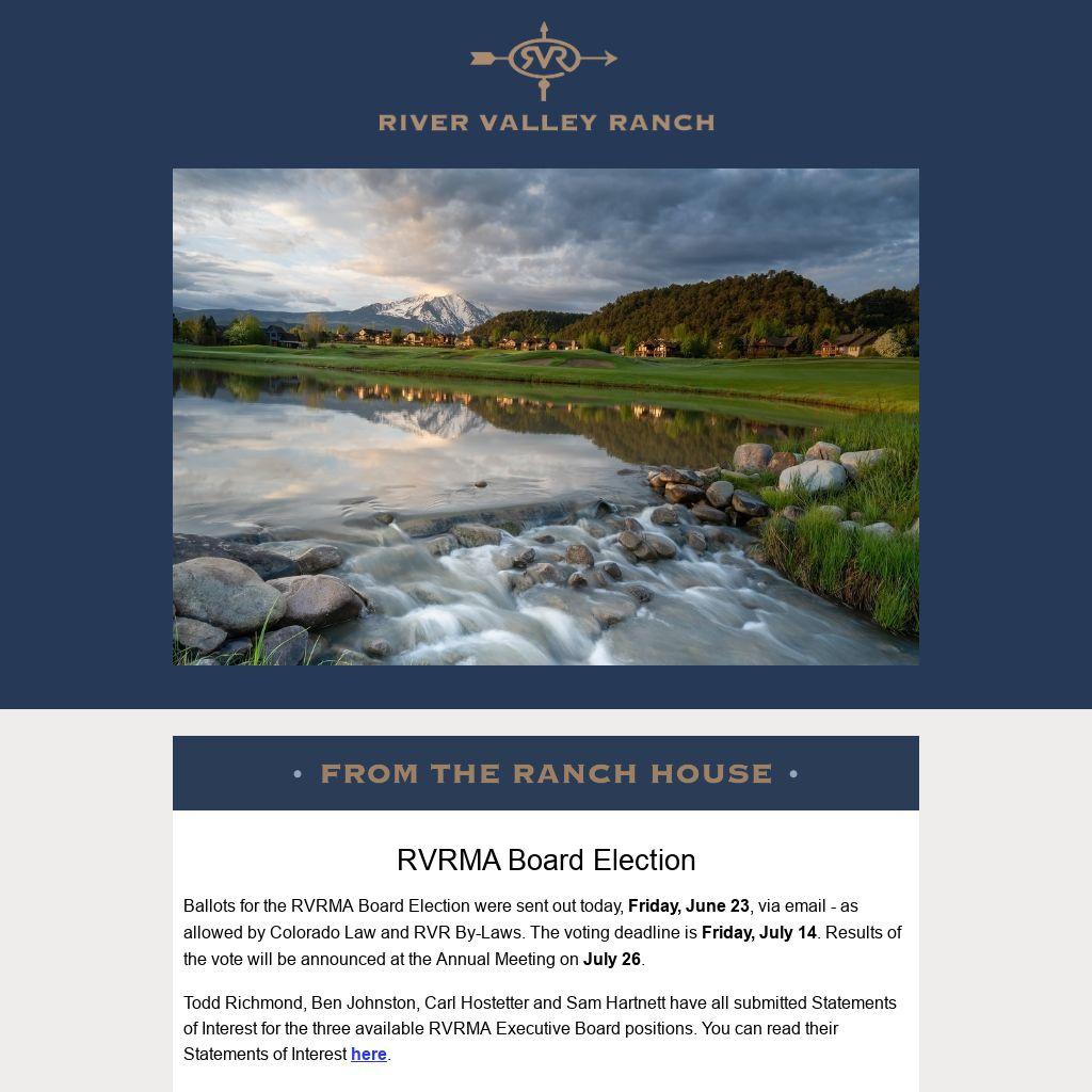 Ballots for the RVRMA Board Election were sent out today, Friday, June 23, via email - as allowed by Colorado Law and RVR By-Laws. The voting deadline is Friday, July 14. Results of the vote will be announced at the Annual Meeting on July 26.