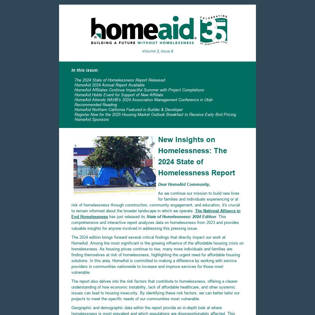 HomeAid’s 2024 Annual Report is now available. This report highlights HomeAid’s overall impact, initiatives, and community transformations. The dedication and hard work of the HomeAid team across the nation, along with our partners and supporters, have made a tangible difference in the fight against homelessness.