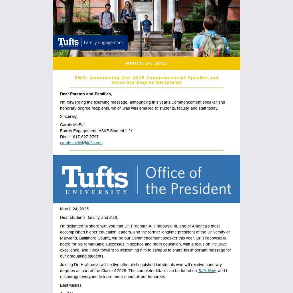 Joining Dr. Hrabowski will be five other distinguished individuals who will receive honorary degrees as part of the Class of 2025. The complete details can be found on Tufts Now, and I encourage everyone to learn more about all our honorees.