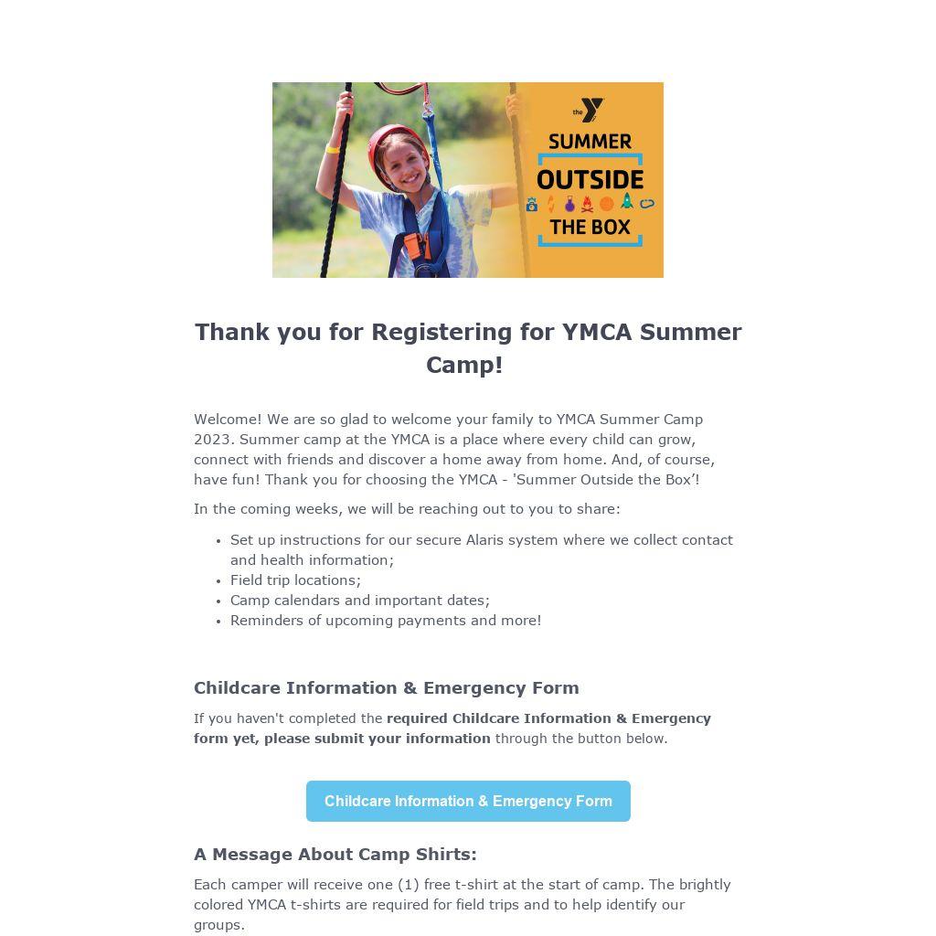 Welcome! We are so glad to welcome your family to YMCA Summer Camp 2023. Summer camp at the YMCA is a place where every child can grow, connect with friends and discover a home away from home. And, of course, have fun! Thank you for choosing the YMCA - 'Summer Outside the Box’!