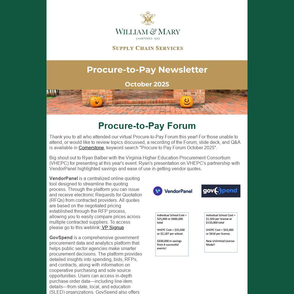 Thank you to all who attended our virtual Procure-to-Pay Forum this year! For those unable to attend, or would like to review topics discussed, a recording of the Forum, slide deck, and Q&A is available in Cornerstone, keyword search "Procure to Pay Forum October 2025".