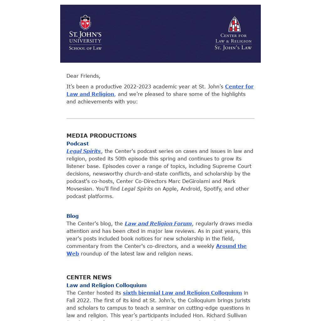 It’s been a productive 2022-2023 academic year at St. John’s Center for Law and Religion, and we’re pleased to share some of the highlights and achievements with you: