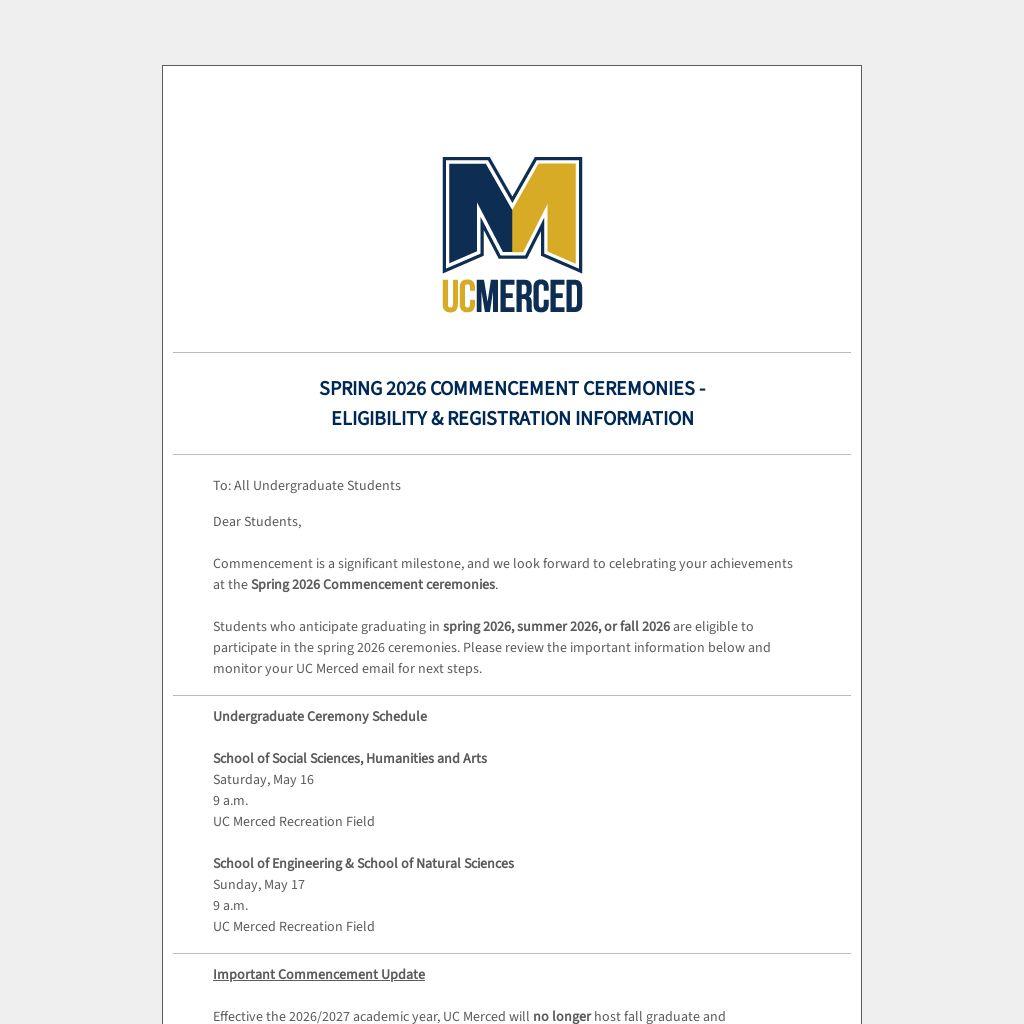 Effective the 2026/2027 academic year, UC Merced will no longer host fall graduate and undergraduate commencement ceremonies.