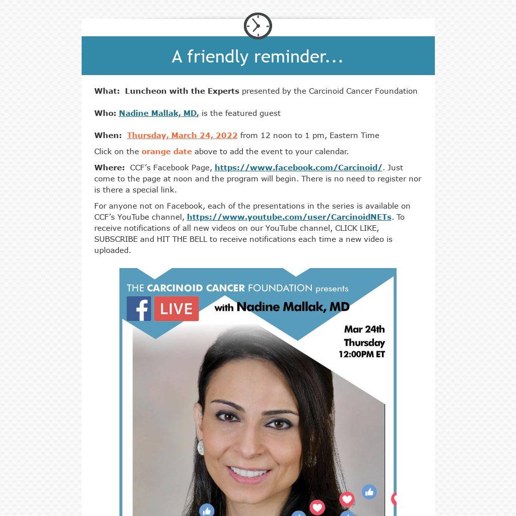 For anyone not on Facebook, each of the presentations in the series is available on CCF’s YouTube channel, https://www.youtube.com/user/CarcinoidNETs. To receive notifications of all new videos on our YouTube channel, CLICK LIKE, SUBSCRIBE and HIT THE BELL to receive notifications each time a new video is uploaded.