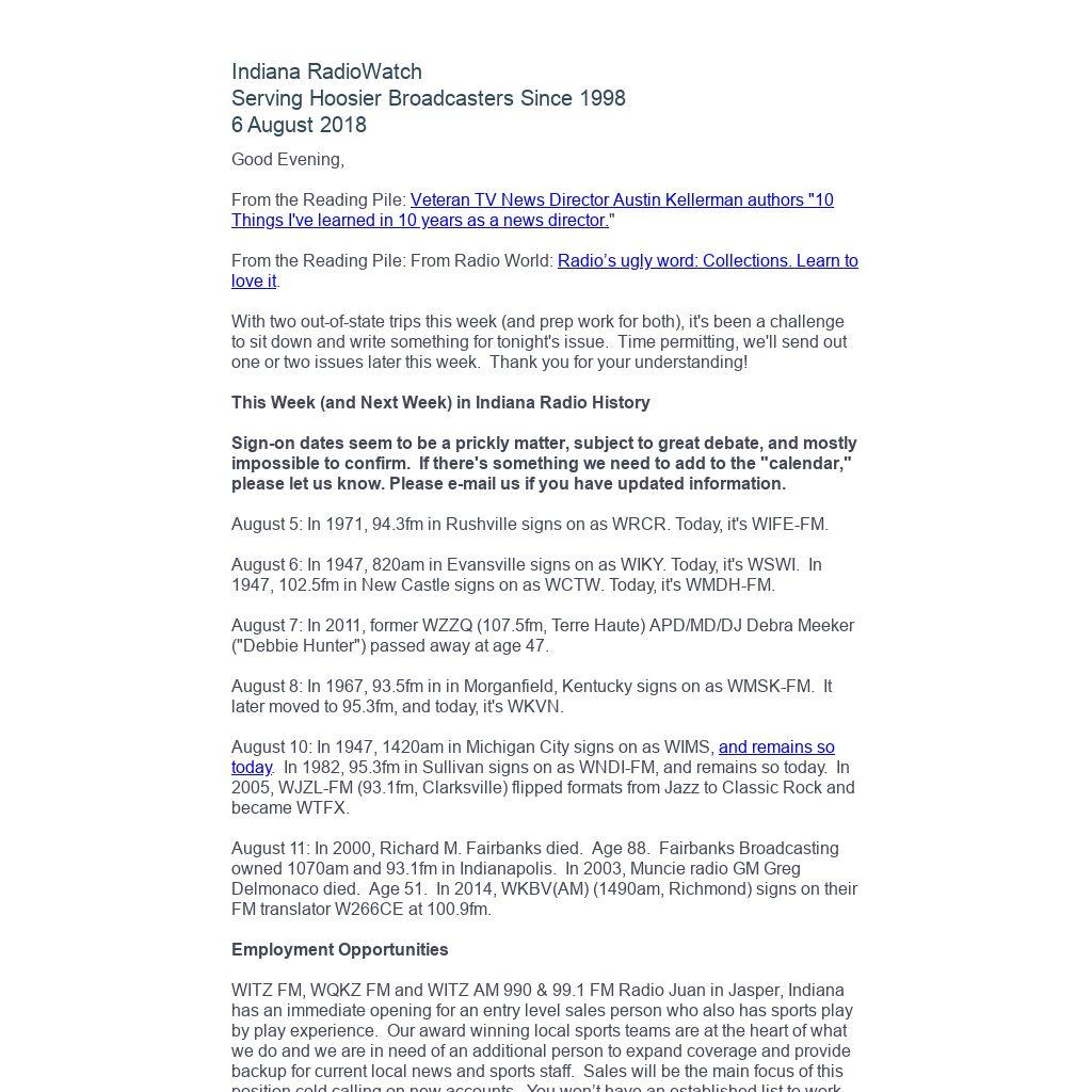 Indiana RadioWatch subscriptions are free. To subscribe, send an e-mail to irw@well.com and we'll add you. After publication, we archive Indiana RadioWatch on the Indiana Radio Archive at http://www.indianaradio.net. Please e-mail us your news stories and employment opportunities.