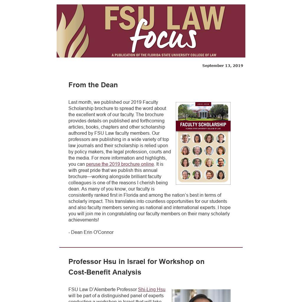 Last month, we published our 2019 Faculty Scholarship brochure to spread the word about the excellent work of our faculty. The brochure provides details on published and forthcoming articles, books, chapters and other scholarship authored by FSU Law faculty members. Our professors are publishing in a wide variety of top law journals and their scholarship is relied upon by policy makers, the legal profession, courts and the media. For more information and highlights, you can peruse the 2019 brochure online. It is with great pride that we publish this annual brochure—working alongside brilliant faculty colleagues is one of the reasons I cherish being dean. As many of you know, our faculty is consistently ranked first in Florida and among the nation’s best in terms of scholarly impact. This translates into countless opportunities for our students and also faculty members serving as national and international experts. I hope you will join me in congratulating our faculty members on their many scholarly achievements!