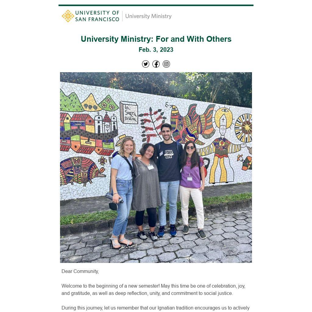 We all are called to be people for and with others. And we can respond in many ways. A group of USF students just returned from an Arrupe Immersion in the Ecuadorian rainforest where they learned more about Indigenous ecologies, culture and education following the invitation of Pope Francis in the Laudato Si encyclical to take care of our common home. In addition, two of our resident ministers and graduate students at USF, Jesús (MIMS) and Ana Karen (CEL), traveled to Central America along with Professor Amy Argenal EdD, and Faith Williams (MIMS student) last December to visit and listen to communities in El Salvador and Honduras.