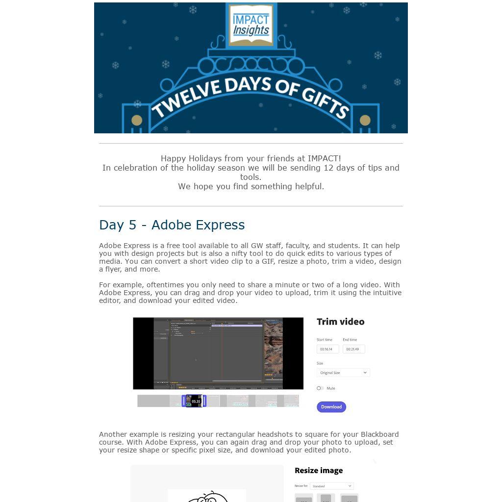 Happy Holidays from your friends at IMPACT! In celebration of the holiday season we will be sending 12 days of tips and tools. We hope you find something helpful.