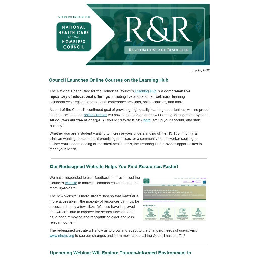 The National Health Care for the Homeless Council’s Learning Hub is a comprehensive repository of educational offerings, including live and recorded webinars, learning collaboratives, regional and national conference sessions, online courses, and more.