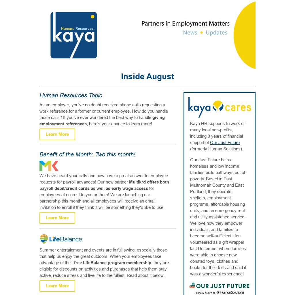 | Kaya HR supports to work of many local non-profits, including 3 years of financial support of Our Just Future (formerly Human Solutions).