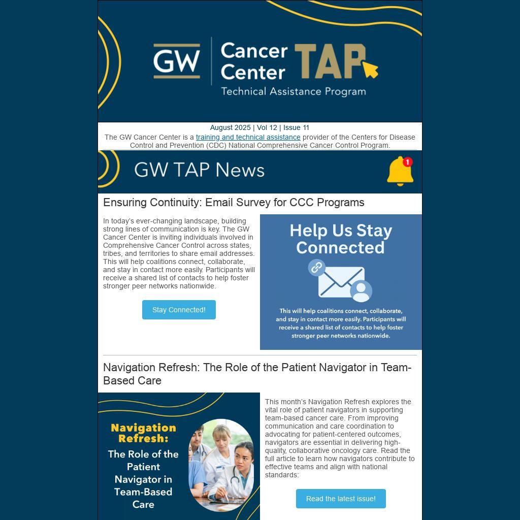 In today’s ever-changing landscape, building strong lines of communication is key. The GW Cancer Center is inviting individuals involved in Comprehensive Cancer Control across states, tribes, and territories to share email addresses. This will help coalitions connect, collaborate, and stay in contact more easily. Participants will receive a shared list of contacts to help foster stronger peer networks nationwide.