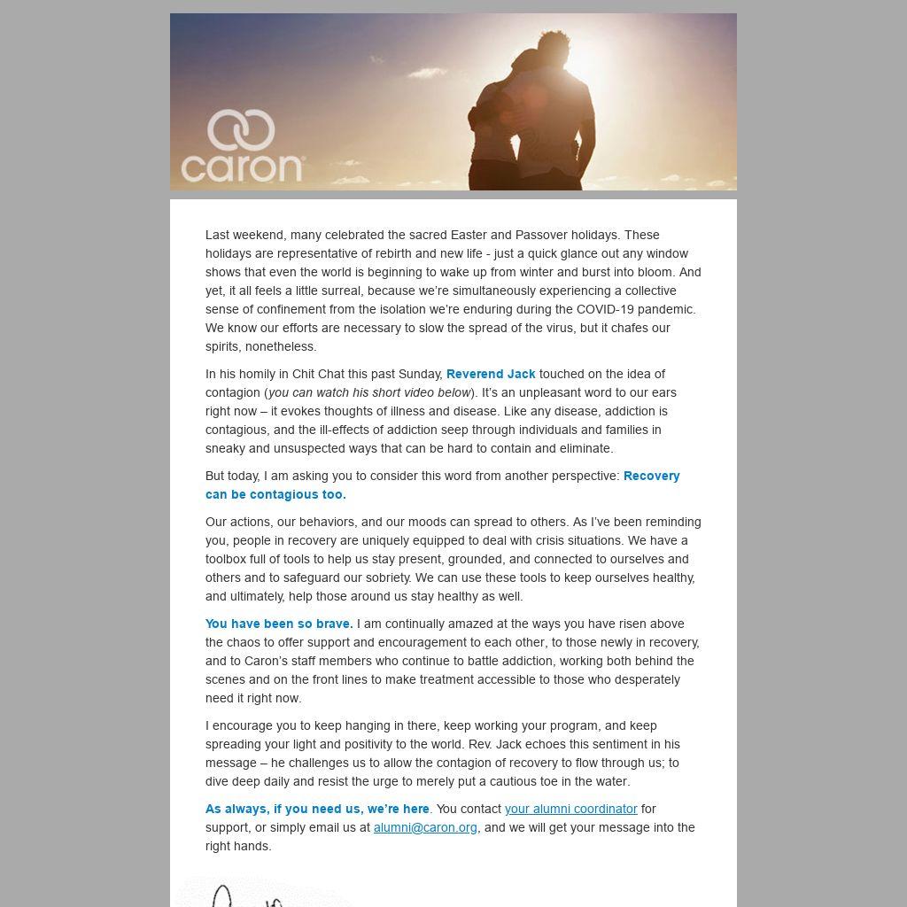 You have been so brave. I am continually amazed at the ways you have risen above the chaos to offer support and encouragement to each other, to those newly in recovery, and to Caron’s staff members who continue to battle addiction, working both behind the scenes and on the front lines to make treatment accessible to those who desperately need it right now.