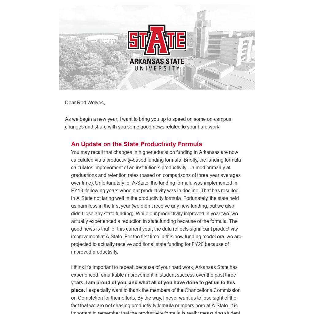 You may recall that changes in higher education funding in Arkansas are now calculated via a productivity-based funding formula. Briefly, the funding formula calculates improvement of an institution’s productivity – aimed primarily at graduations and retention rates (based on comparisons of three-year averages over time). Unfortunately for A-State, the funding formula was implemented in FY18, following years when our productivity was in decline. That has resulted in A-State not faring well in the productivity formula. Fortunately, the state held us harmless in the first year (we didn’t receive any new funding, but we also didn’t lose any state funding). While our productivity improved in year two, we actually experienced a reduction in state funding because of the formula. The good news is that for this current year, the data reflects significant productivity improvement at A-State. For the first time in this new funding model era, we are projected to actually receive additional state funding for FY20 because of improved productivity.