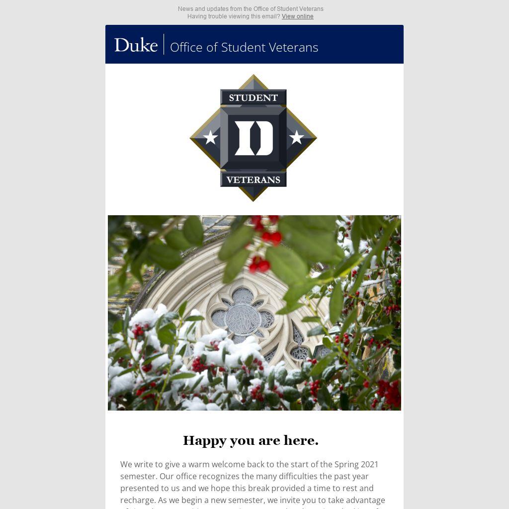 We would also like to take a moment to express our continued support to the veteran and military-affiliated community here at Duke during this time. We are aware that more states are calling upon the National Guard to provide COVID-19 vaccine support and troops are deployed to D.C. for the inauguration. In the case you are enrolled in credit coursework and you are called up, our office is here to provide guidance and advocacy for you. Whether it be reminders of the past, concerns about close friends who are currently serving downrange, or uncertainty about your next duty assignment, we recognize that this can be a challenging time and are here to ensure your success every step of the way. Please don't hesitate to reach out to us.