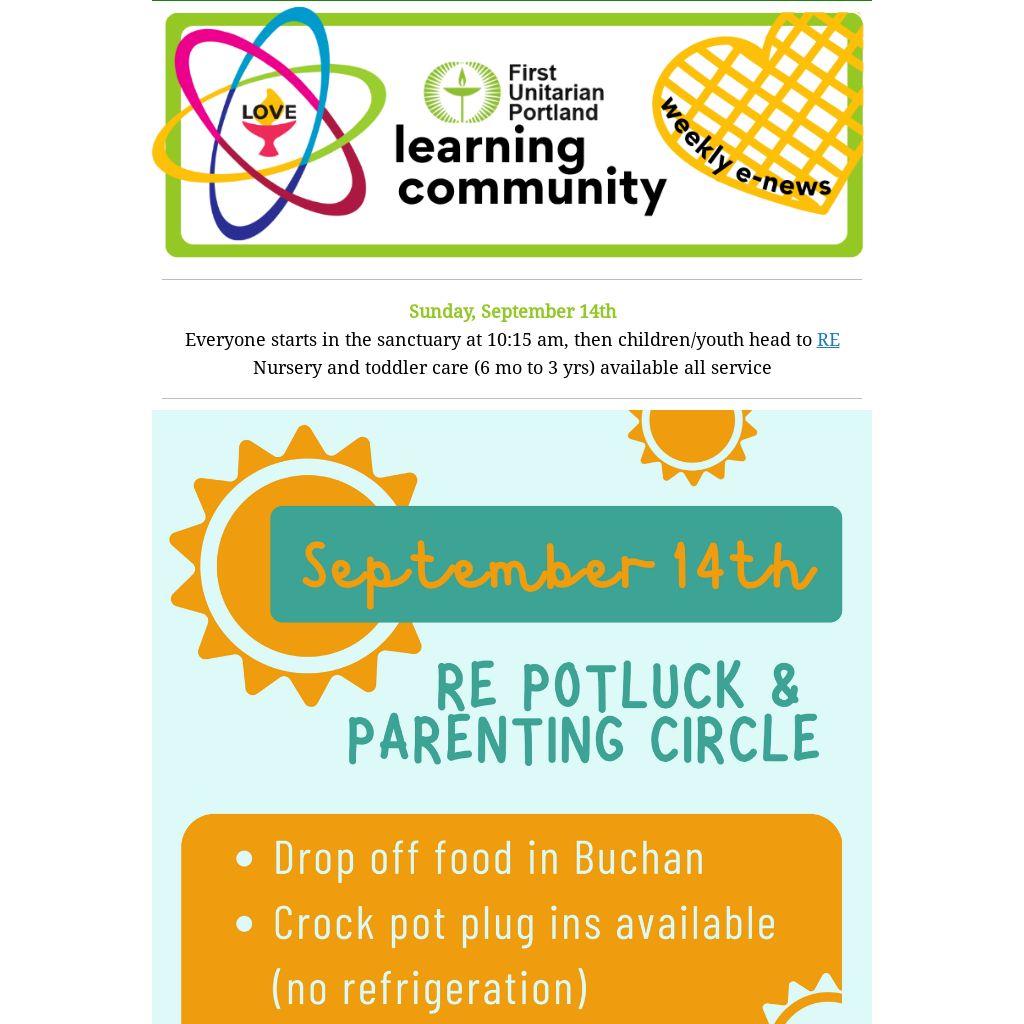 RE starts this Sunday! It's going to be a fun, full Sunday. Friends and visitors especially welcome.