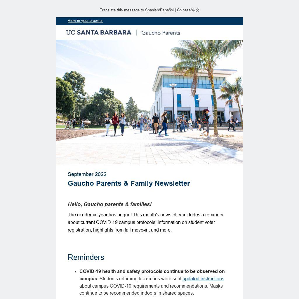 Registration is now open for 2022 Parents & Family Weekend - November 4 -5. Visit our website for more information and to view the schedule of events. Plan your weekend in Santa Barbara with your Gaucho and remember to register before October 31!