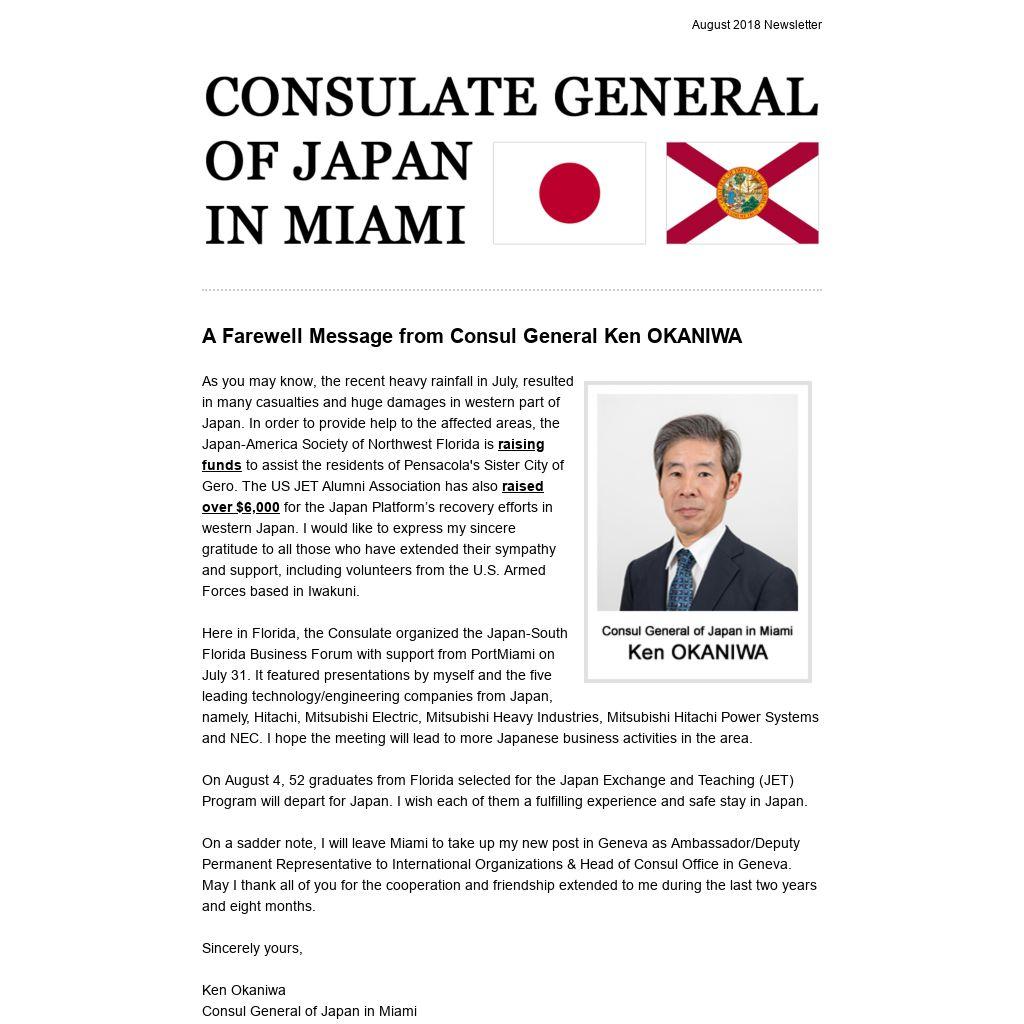 On August 4, 52 graduates from Florida selected for the Japan Exchange and Teaching (JET) Program will depart for Japan. I wish each of them a fulfilling experience and safe stay in Japan.