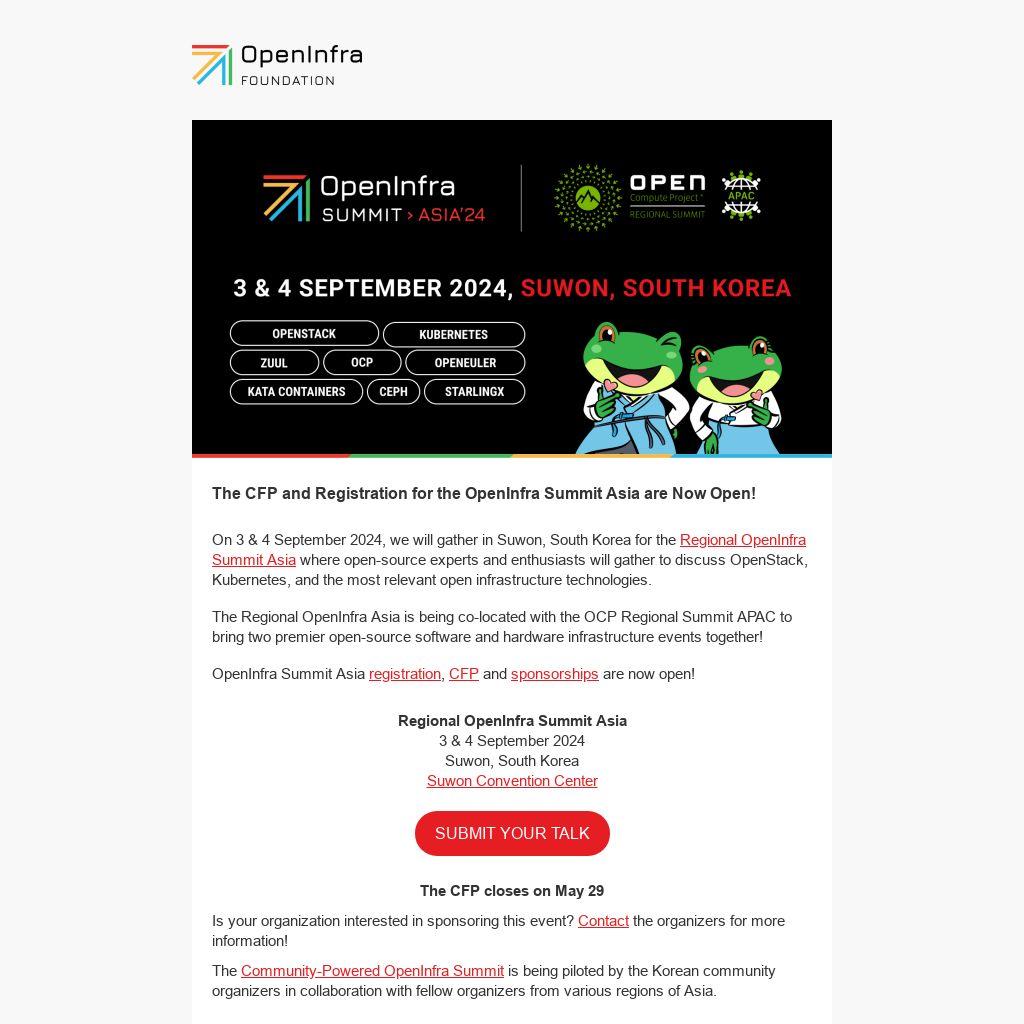 On 3 & 4 September 2024, we will gather in Suwon, South Korea for the Regional OpenInfra Summit Asia where open-source experts and enthusiasts will gather to discuss OpenStack, Kubernetes, and the most relevant open infrastructure technologies.