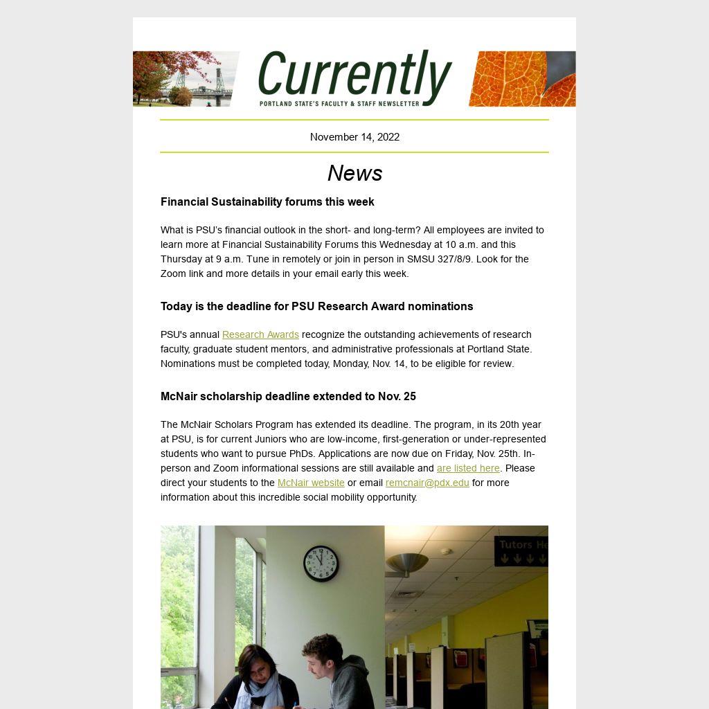 Currently is Portland State University’s weekly faculty and staff newsletter. It is published online every Monday during the academic year by University Communications. News items should be emailed by noon the Tuesday before publication. See theCurrently website for submission guidelines and schedule.