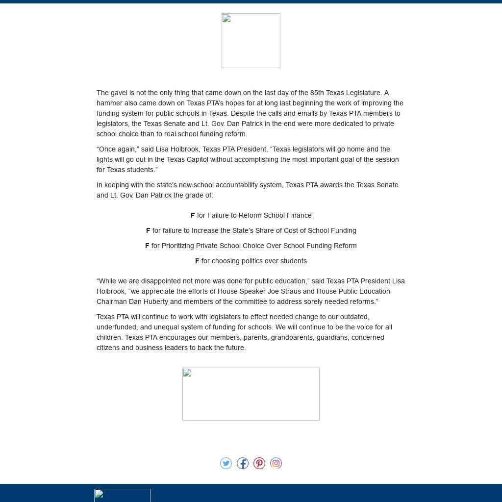 Texas PTA will continue to work with legislators to effect needed change to our outdated, underfunded, and unequal system of funding for schools. We will continue to be the voice for all children. Texas PTA encourages our members, parents, grandparents, guardians, concerned citizens and business leaders to back the future.