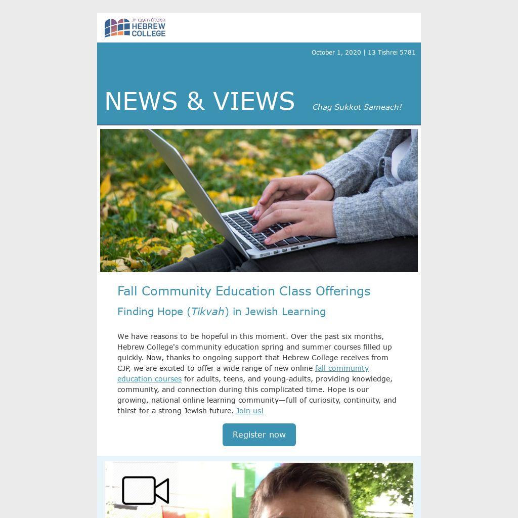 We have reasons to be hopeful in this moment. Over the past six months, Hebrew College's community education spring and summer courses filled up quickly. Now, thanks to ongoing support that Hebrew College receives from CJP, we are excited to offer a wide range of new online fall community education courses for adults, teens, and young-adults, providing knowledge, community, and connection during this complicated time. Hope is our growing, national online learning community—full of curiosity, continuity, and thirst for a strong Jewish future. Join us!