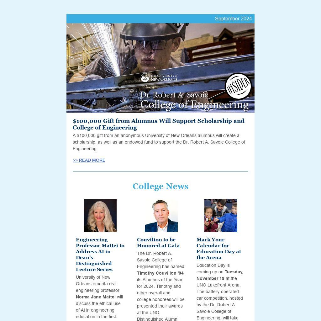 A $100,000 gift from an anonymous University of New Orleans alumnus will create a scholarship, as well as an endowed fund to support the Dr. Robert A. Savoie College of Engineering.