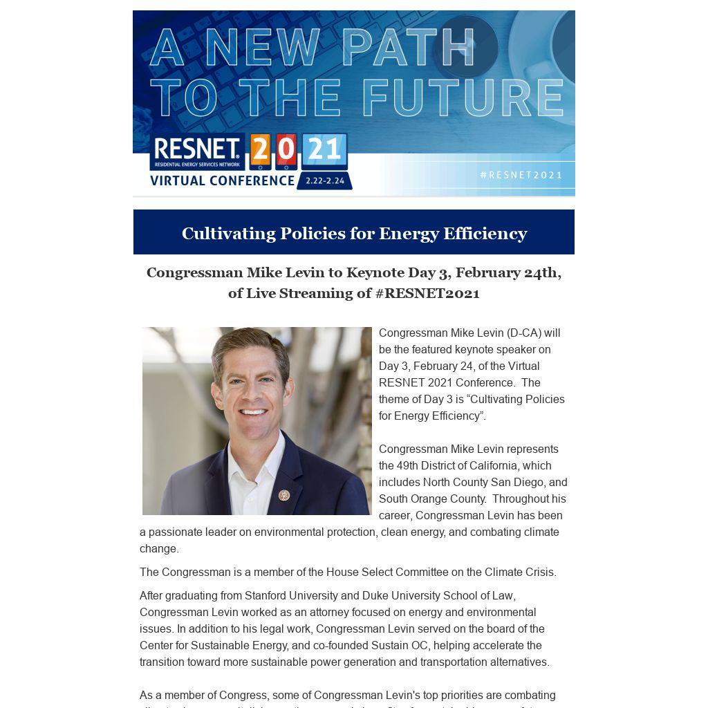 Congressman Mike Levin (D-CA) will be the featured keynote speaker on Day 3, February 24, of the Virtual RESNET 2021 Conference. The theme of Day 3 is “Cultivating Policies for Energy Efficiency”.