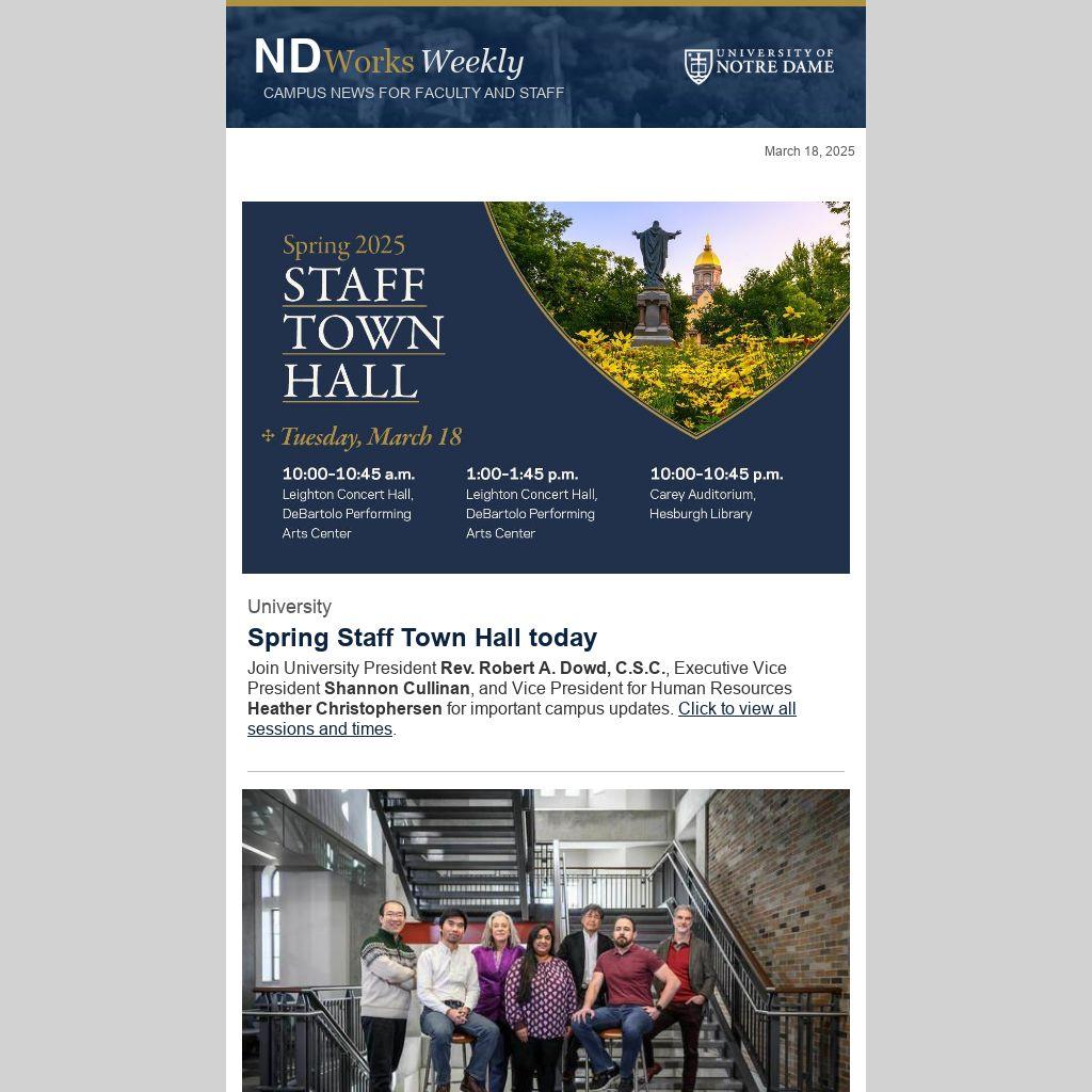Join University President Rev. Robert A. Dowd, C.S.C., Executive Vice President Shannon Cullinan, and Vice President for Human Resources Heather Christophersen for important campus updates. Click to view all sessions and times.