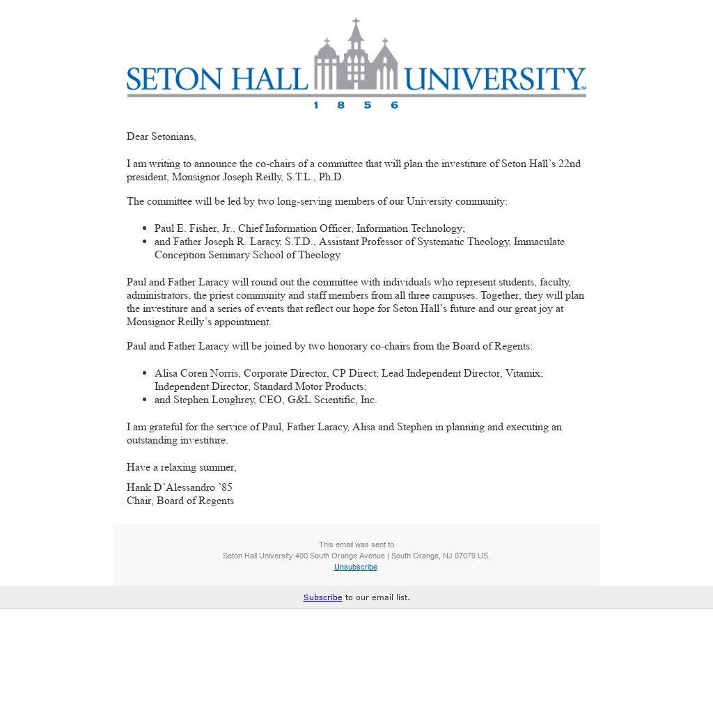 I am writing to announce the co-chairs of a committee that will plan the investiture of Seton Hall’s 22nd president, Monsignor Joseph Reilly, S.T.L., Ph.D.