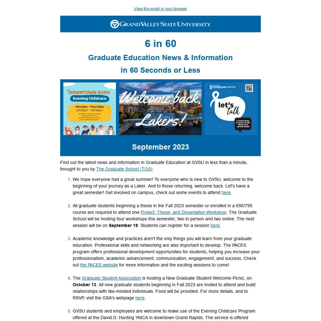 Find out the latest news and information in Graduate Education at GVSU in less than a minute, brought to you byThe Graduate School (TGS):