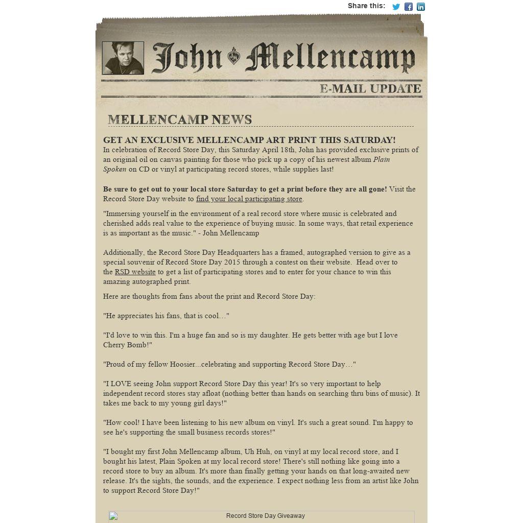 "I bought my first John Mellencamp album, Uh Huh, on vinyl at my local record store, and I bought his latest, Plain Spoken at my local record store! There's still nothing like going into a record store to buy an album. It's more than finally getting your hands on that long-awaited new release. It's the sights, the sounds, and the experience. I expect nothing less from an artist like John to support Record Store Day!"