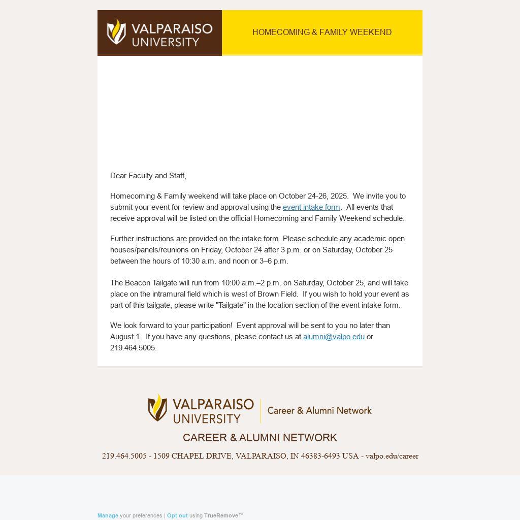 We look forward to your participation! Event approval will be sent to you no later than August 1. If you have any questions, please contact us at alumni@valpo.edu or 219.464.5005.