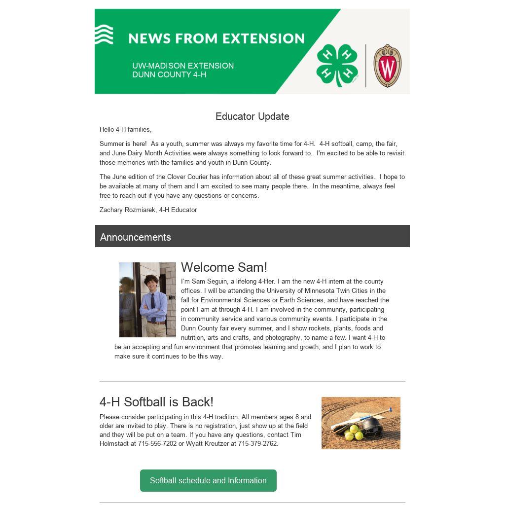 Summer is here! As a youth, summer was always my favorite time for 4-H. 4-H softball, camp, the fair, and June Dairy Month Activities were always something to look forward to. I'm excited to be able to revisit those memories with the families and youth in Dunn County.