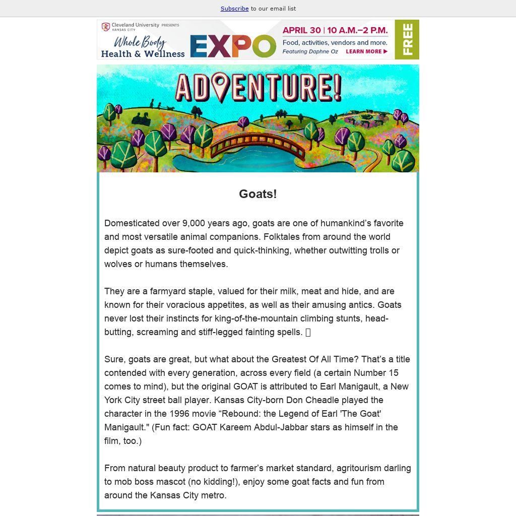 From natural beauty product to farmerās market standard, agritourism darling to mob boss mascot (no kidding!), enjoy some goat facts and fun from around the Kansas City metro.