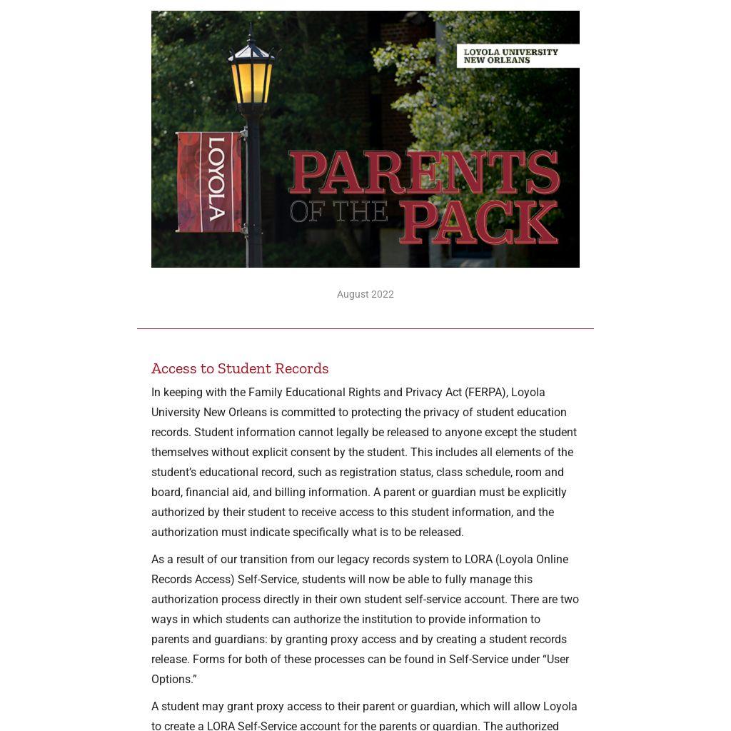 In keeping with the Family Educational Rights and Privacy Act (FERPA), Loyola University New Orleans is committed to protecting the privacy of student education records. Student information cannot legally be released to anyone except the student themselves without explicit consent by the student. This includes all elements of the student’s educational record, such as registration status, class schedule, room and board, financial aid, and billing information. A parent or guardian must be explicitly authorized by their student to receive access to this student information, and the authorization must indicate specifically what is to be released.