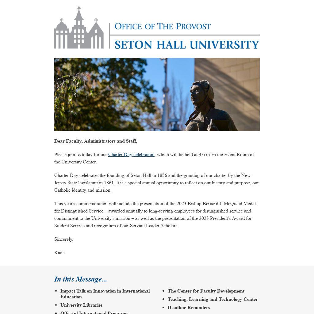 Charter Day celebrates the founding of Seton Hall in 1856 and the granting of our charter by the New Jersey State legislature in 1861. It is a special annual opportunity to reflect on our history and purpose, our Catholic identity and mission.